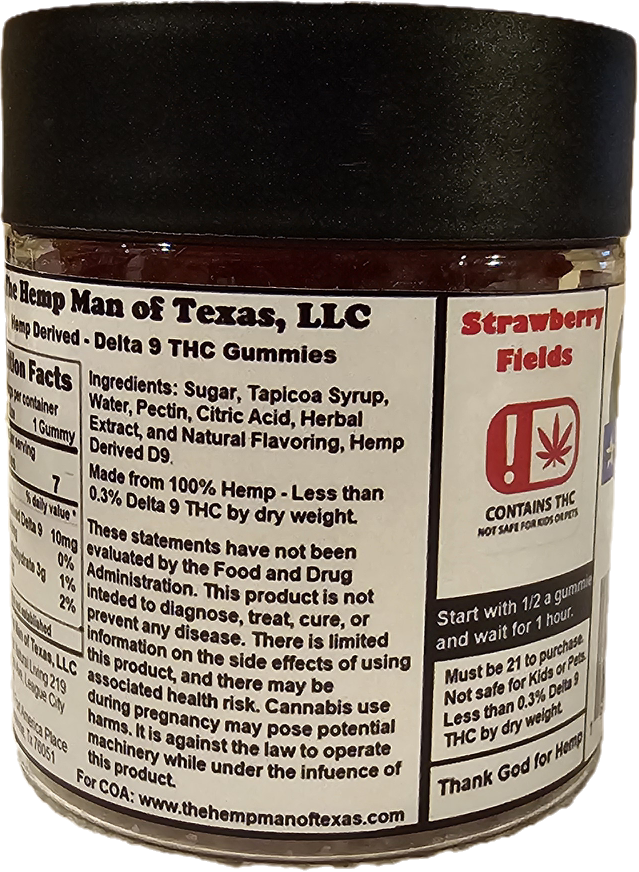 Strawberry Fields :Strawberry Lemonade gummies are delicious and are 100% Hemp derived. Each gummy contains 10mg Hemp Derived D9 THC. Serving size is 1 gummy, take half a gummy to start. Full effects will take about 1 -1.5hrs. * Strawberry Fields D9 Gummies are strong and for the experienced. Start with half a gummy and wait for 1.5hrs before consuming any more.